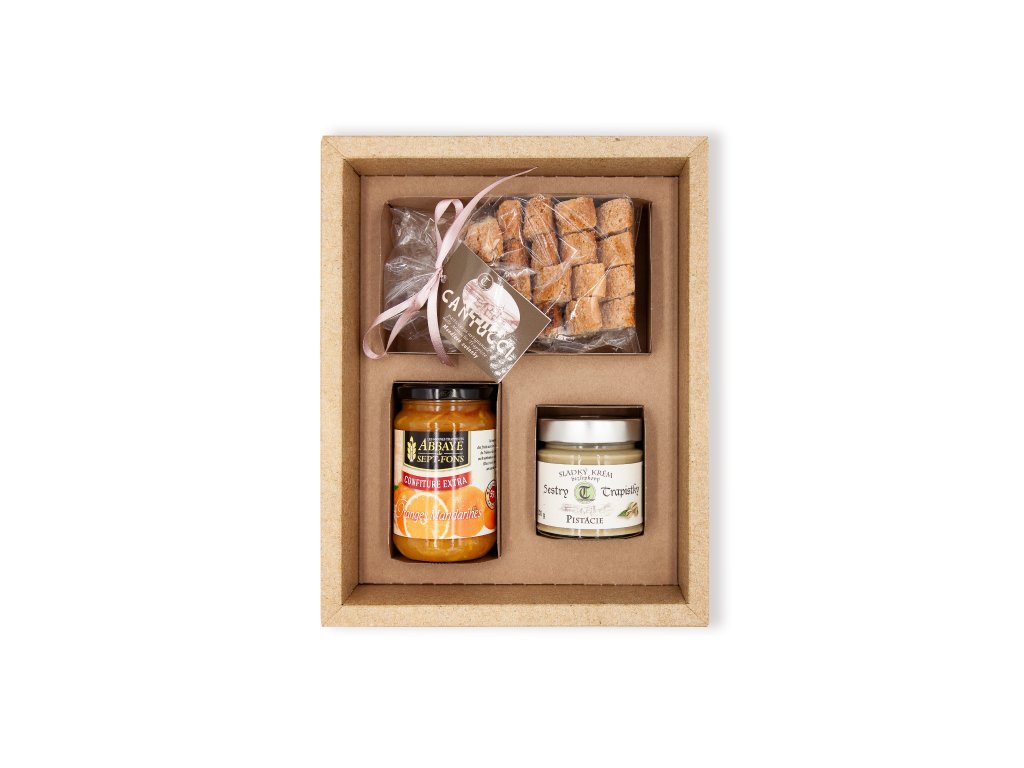 Sladký dárkový balíček s pistáciovým krémem od sester trapistek, mandlovými sušenkami a s výběrovým džemem pomeranč a mandarinky z bratrského kláštera ve Francii.