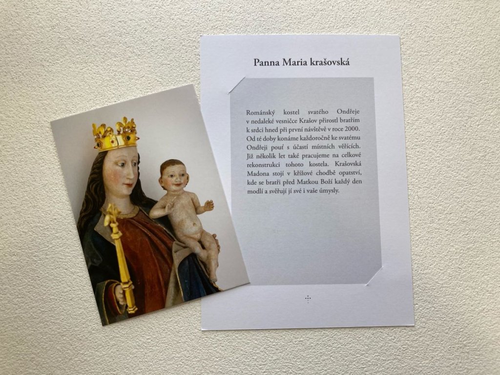 Každá zo šiestich pohľadníc je ručne vložená do vlastného listu, ktorý obsahuje sprievodné fotografie s komentárom. Z neho sa môžete dozvedieť o pôvode Madony alebo o jej úlohe v živote nášho spoločenstva. Môžete tak preniknúť trochu hlbšie do každodennej mníšskej modlitby.